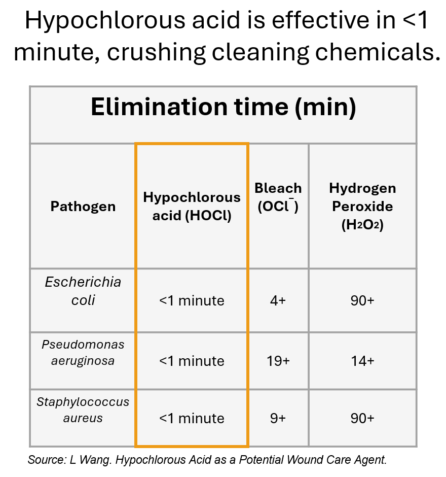 Studies show that hypochlorous kills germs faster than bleach and other leading disinfectants